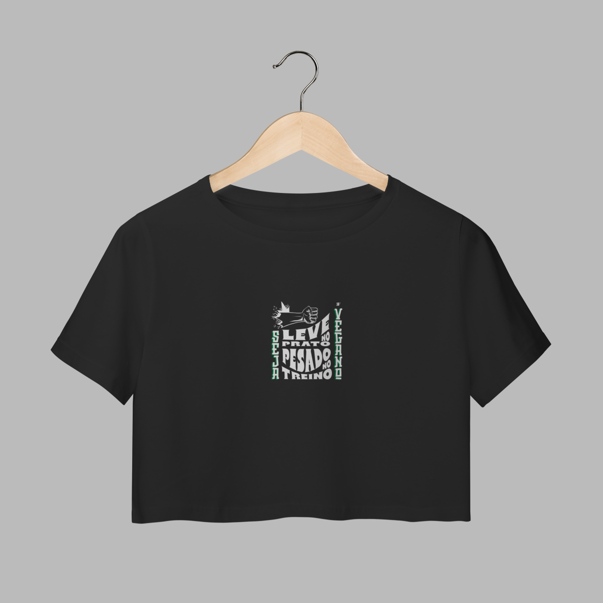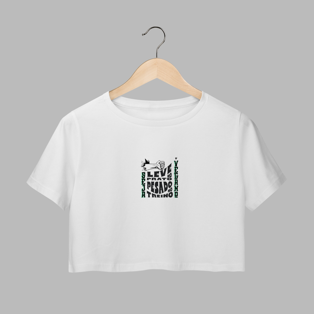 Camiseta cropped estilosa com estampa “Leve no Prato, Pesado no Treino” – para quem acredita que equilíbrio e dedicação andam juntos.